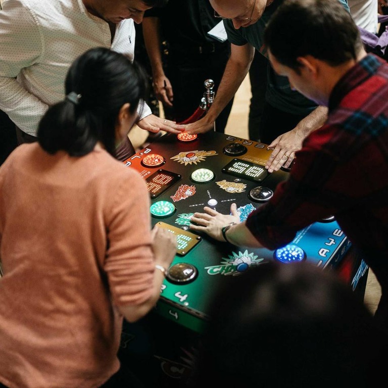 In the four-player reaction game, the winner is the one who hits their corresponding color lights faster than their opponents. Hitting the wrong color will result in a penalty!