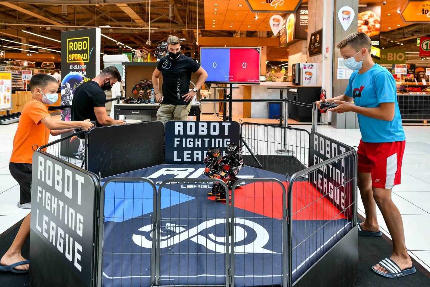 The guests can control the robots with wireless remote controls. After a short tutorial and one minute of practice, they can immediately face each other and find out who is the strongest.