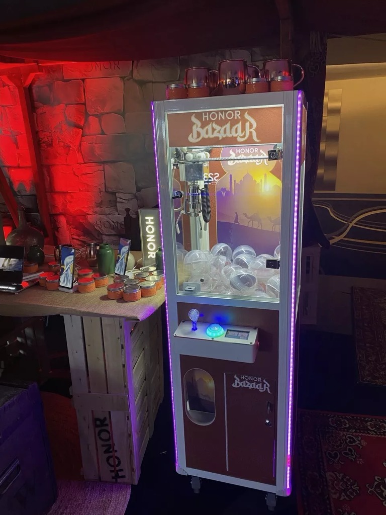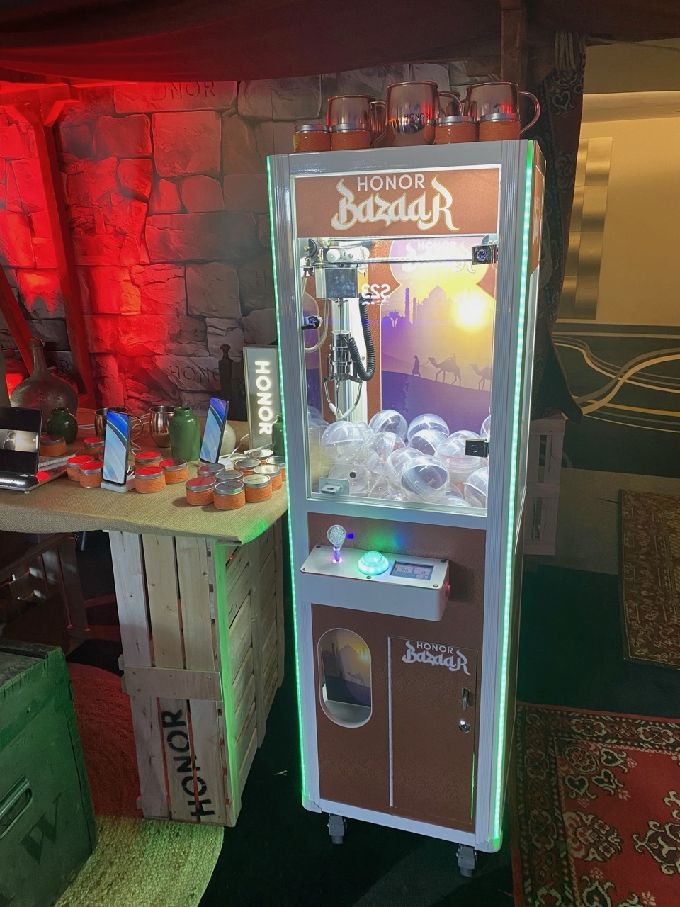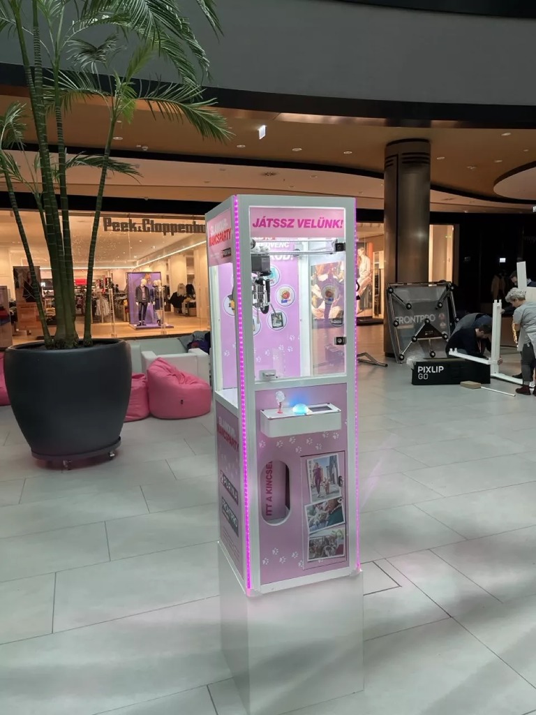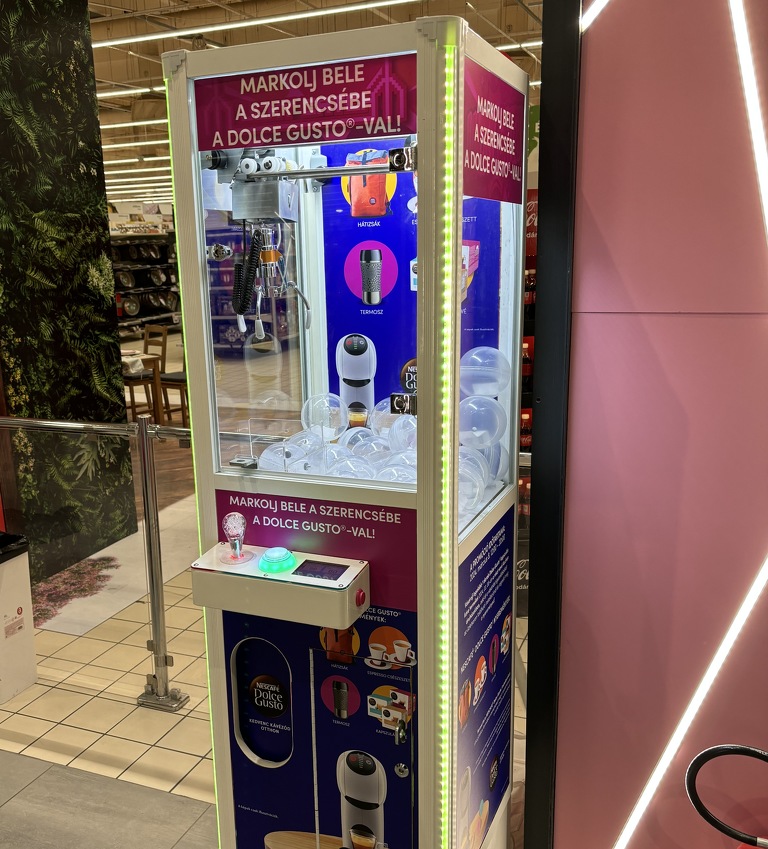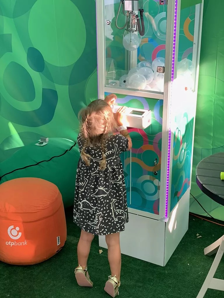A kimarkolt gömböt a nyílás fölé viszi a kar, ahol elengedi, így a vendég már ki is veheti az ajándékát.