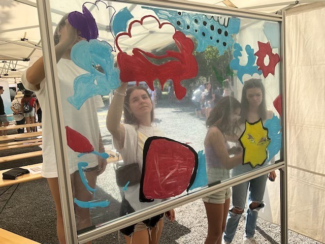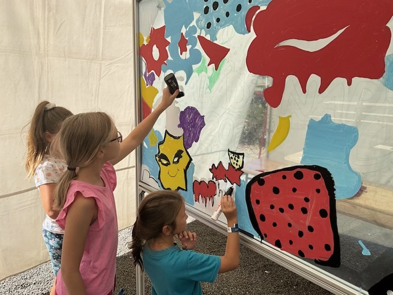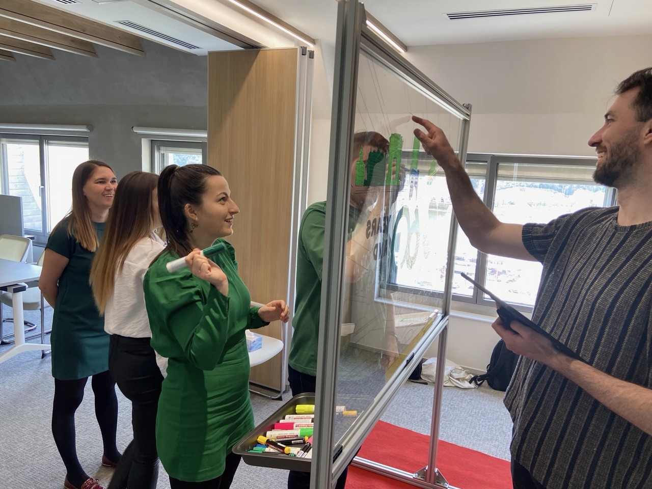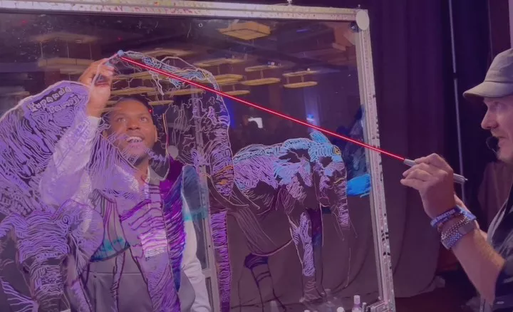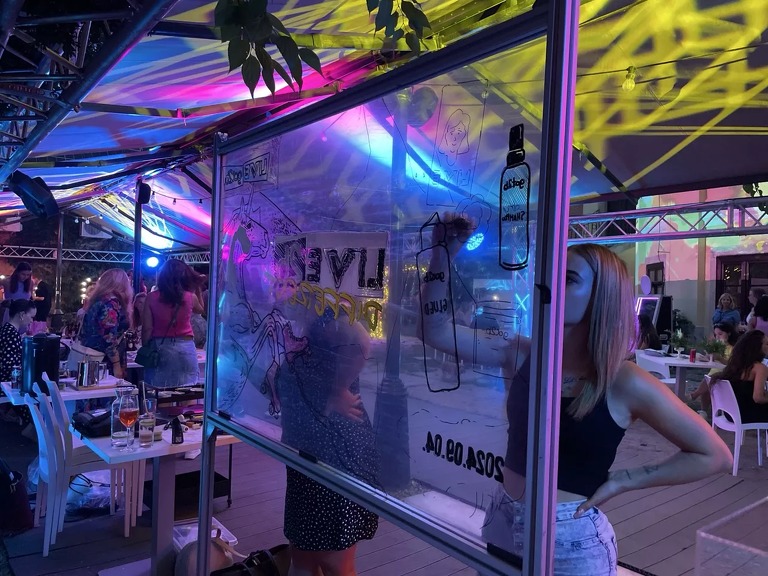 Kollégánk végig segíti az alkotás folyamatát onnantól kezdve, hogy az érdeklődő vendégeknek kezébe adja a megfelelő színű filcet / festéket és hátulról egy laserpointer segítségével mutatja, hogy hol rajzoljon. Amennyiben a helyszín igényli, mikroportot is biztosítunk, amivel biztosan eljutnak az instrukciók a tábla túloldalára.