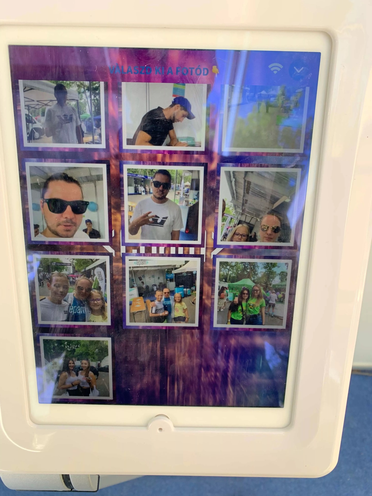 A nyomtatásra két lehetőség van: 1. Kollégánk a standhoz/helyszínhez tereli a vendégeket, ahol egy iPad-en kiválaszthatják a saját fotójukat, amit azonnal ki is tudnak nyomtatni. (Egy kép 8-10 mp) 2. Akkumulátoros nyomtatóval azonnal kinyomtatjuk a képet ott, ahol fotóztuk. (Egy kép 50-60 mp.)